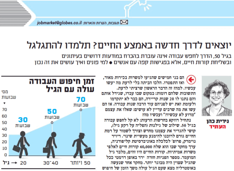 נתחיל דווקא עם החדשות הרעות ונתקף את מה שכולם כבר יודעים, חיפוש עבודה בגיל 50 זה לא דבר פשוט. שילוב של גילנות (אפליה על רקע גיל), פחות הזדמנויות, הקושי להגדיר את עצמנו מחדש וגם הצורך לשמר רמת חיים, כל אלה גורמים לרובנו לא לעשות את השינוי הזה. דיויד נוימרק, פרופ לכלכלה באוניברסיטת קליפורניה ערך מחקר שבו הוא שלח 40,000 קו"ח לאלפי משרות אמתיות. קו"ח היו זהים, מלבד גיל המועמד. כמות הפניות בחזרה, כאלה של מעסיקים שביקשו לראיין, ירדה דרמטית בין צעירים לגילאי הביניים, ועוד יותר בין גילאי הביניים למועמדים מבוגרים. מחקר אחר שנערך באוסטרליה מצא שעם הגיל עולה משך זמן חיפוש העבודה. בעוד בני העשרים מחפשים כ 30 שבועות, בנין השלושים והארבעים כ 50 שבועות ומעל גיל חמישים כמעט 70 שבועות. ובאוניברסיטת בוסטון מצאו שהיצע העבודה העומד בפני עובדים מבוגרים מצטמצם גם הוא באופן משמעותי והם מתועלים לתפקידים שמוגדרים עבור עובדים מבוגרים יותר, תפקידי שירותים לרוב, כאלה שלא זקוקים ליכולות מעודכנות.