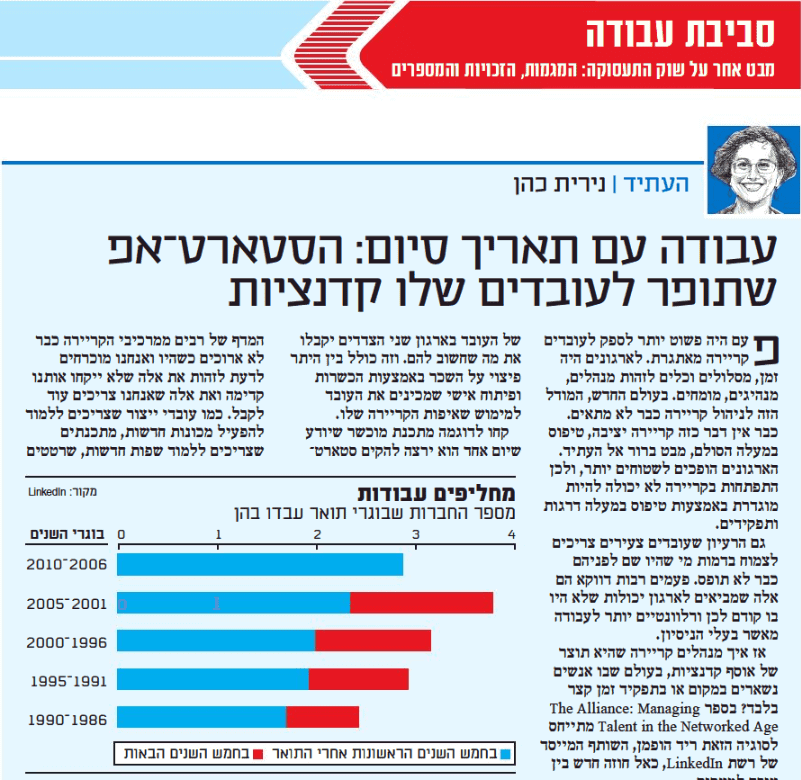 אז איך מנהלים קריירה אם היא תוצר של אוסף קדנציות, בעולם שבו אנשים נשארים במקום או תפקיד זמן קצר בלבד? בספר The Alliance: Managing Talent in the Networked Age מתייחס לסוגיה זו השותף המייסד של LinkedIn ריד הופמן כהצגה של חוזה חדש בין עובד למעסיק. כי כשהמודל הקודם נשבר ברור כבר שבעולם של שינויים מהירים אין דבר כזה חוזה תעסוקה ארוך טווח. על פי המידע של לינקדאין בוגרי האקדמיה כיום עוברים פי שניים עבודות בחמש השנים הראשונות שלהם אחרי הלימודים, לעומת מקביליהם לפני שלושים שנה. הספר מציע לנו להפסיק לחשוב על העובדים כמשפחה אבל גם לא כסוכנים חופשיים ולא מחויבים ובמקום לחשוב עליהם כעל בני ברית. העובדים עוזרים לארגון לעשות מה שהוא צריך בכדי להישאר רלוונטי ולהצליח בעסקים ובתמורה הארגון עוזר לעובדים להישאר רלוונטיים ולהצליח בקריירה של עצמם. וזה דורש משני הצדדים גם אמון וגם מחויבות הדדית להשקעה ולהצלחה.