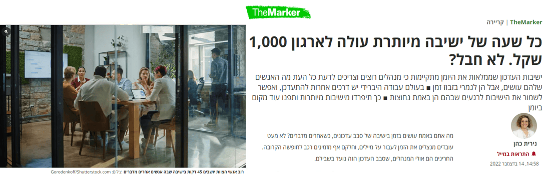 בארגונים רבים מדברים על ישיבות כעל רעה חולה. שנים ארוכות בהן עבדנו עם שילוב של משרד ויומן הרגילו אותנו לעבוד ביחד, מסונכרן, להכניס אנשים לאותו זמן ומרחב. כך הפכו פגישות העדכון לאחד הגורמים המפריעים לעבודה. כשאנחנו ממלאים לעובדים שלנו את היומן בפגישות שמבזבזות להם את הזמן בעבודה על העבודה, אנחנו מקטינים את כמות השעות הפנויות לעבודה עמוקה שמקדמת את העבודה עצמה. חברת reclaimai אספה נתונים על האופן בו אנחנו מבלים את זמננו בעבודה וטוענת שמאז תחילת הקורונה כמות הישיבות גדלה בכ 70% ועובדי ידע נמצאים בממוצע בכ 5 שעות של ישיבות כל יום. וזה מבלי לכלול את הזמן שהולך להכין את הישיבה ואז לסכם את תוצאותיה. לפי מחשבון עלות הישיבות של HBR, אם יש לכם בצוות 10 עובדים בשכר ממוצע במשק שהיה בינואר 2022 כ- 10.500 לחודש, כל שעה של ישיבת צוות עולה לכם כמעט 1000 שקל מבלי ששקללנו את העומס של הישיבות האלה על תשומת הלב ומה הן עושות ליכולת של העובדים להתרכז בשאר הזמן.