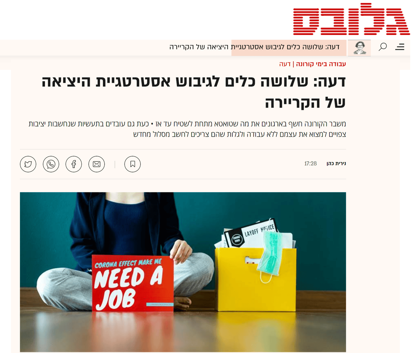 השלכות על מפוטרי הקורונה: דווקא בגלל שנדמה שכולם מחפשים עבודה אז יותר קשה עכשיו, זה זמן מצויין לעצור לרגע ולהגדיר מחדש את האופן שבו אנחנו מדברים על עצמנו מקצועית בעלפה וגם בכתב, בקורות החיים, ברשתות. מיפוי נכון של ניסיון ויכולות בשפה שהיא יותר רחבה מתאור המקצוע שלנו והתפקידים שעשינו יעזור לנו לזהות הזדמנויות. וגם פערים שצריך לסגור, כישורים שצריך לרכוש ותחומים שכדאי ללמוד.