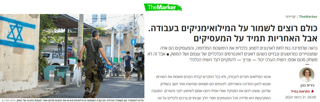 המילואימניקים חוזרים לעבודה ולא בכל המקרים קבלת הפנים תואמת את השירות שעשו. לפעמים הם מוצאים שמישהו אחר יושב בשולחן שלהם, ששינו להם את התפקיד ואולי אפילו זימנו אותם לשימוע לפני פיטורים. התגובה המתבקשת מתרעמת מכל המעסיקים חסרי הלב שבוחרים צרכים כלכליים על פני התרומה שלהם למדינה. אבל זו תגובה ששמה על השוק הפרטי 100% מהאחריות על אותם מילואימניקים ו 0% אחריות על המדינה. כלומר, מאד מאד נוח למדינה לתת לארגונים לספוג כלכלית את התמשכות המלחמה ולצייר אותם כמרושעים ונבזיים אם הם דואגים לאינטרסים הכלכליים של עצמם ושל המשק.